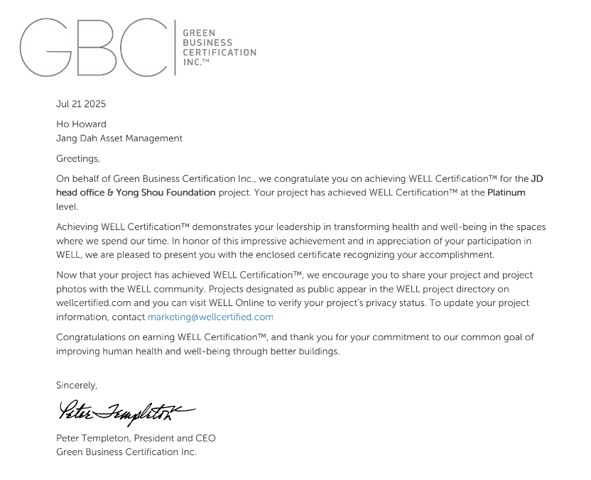 JD正大集團總部榮獲國際 WELL 鉑金級認證,取得全球最高等級之健康建築標章,涵蓋空氣、水、光、營養、運動、熱舒適、聲環境、材料、心理健康與社區等十項核心指標。此一成果不僅是對建築硬體品質的肯定,更代表集團在空間規劃、管理制度與員工照顧層面,已建立完整且可被驗證的健康標準。